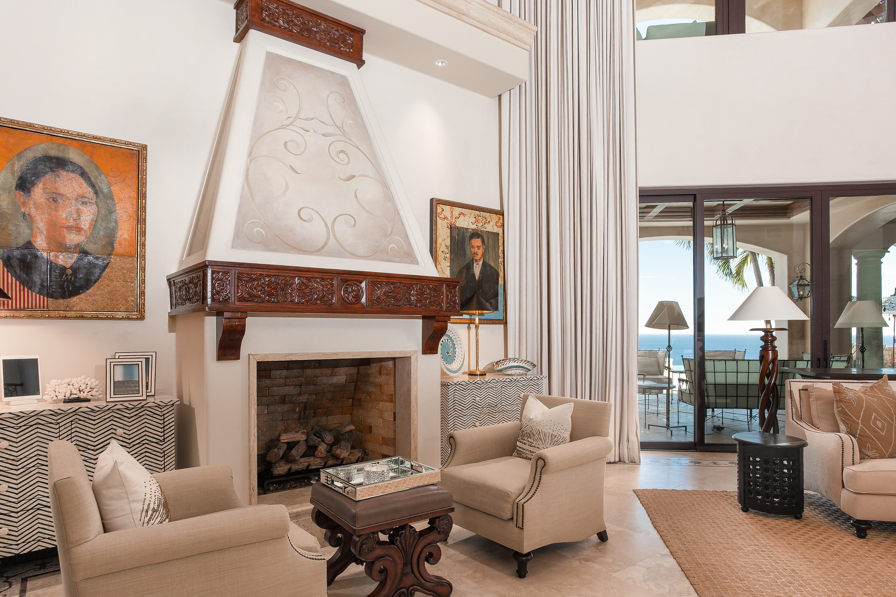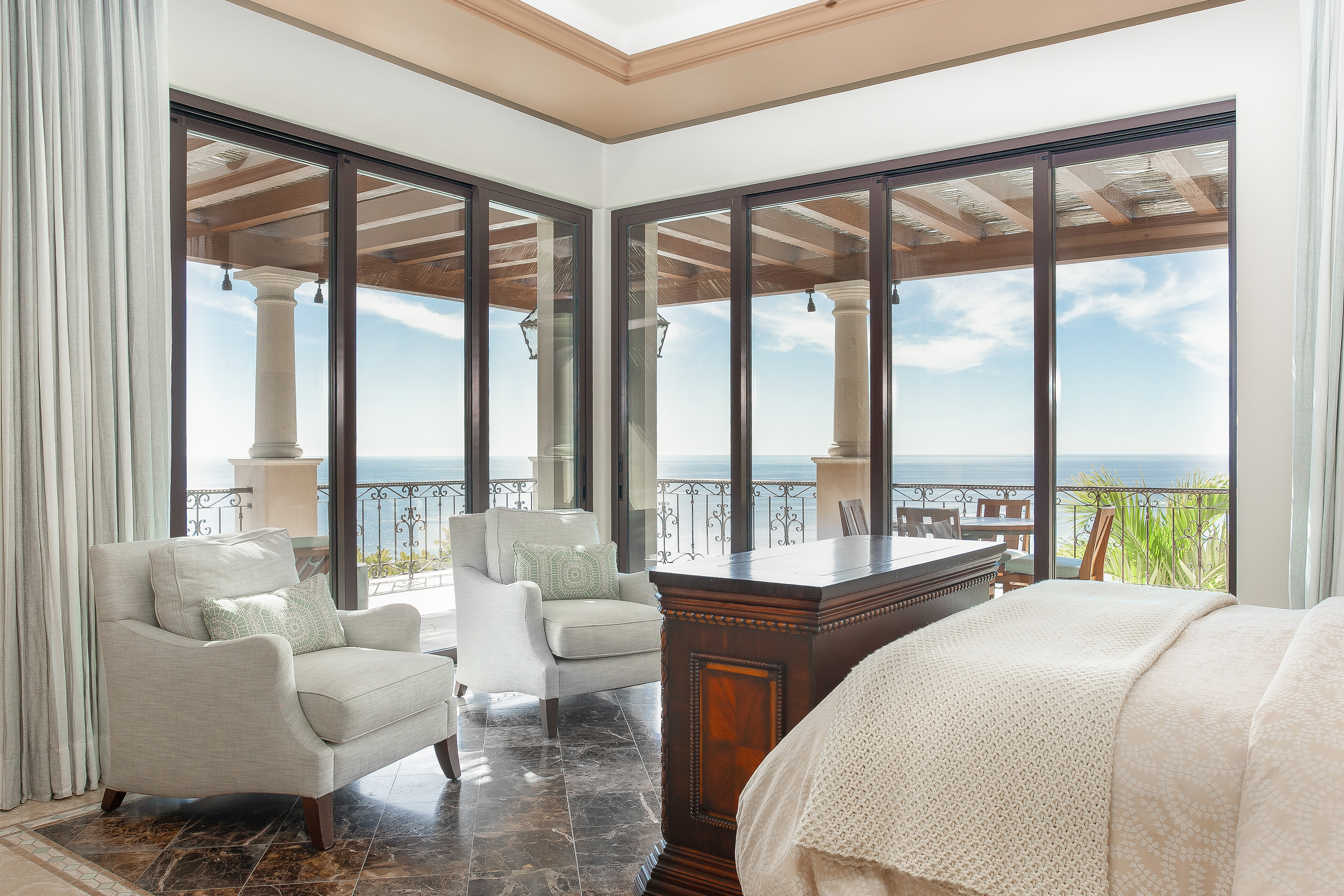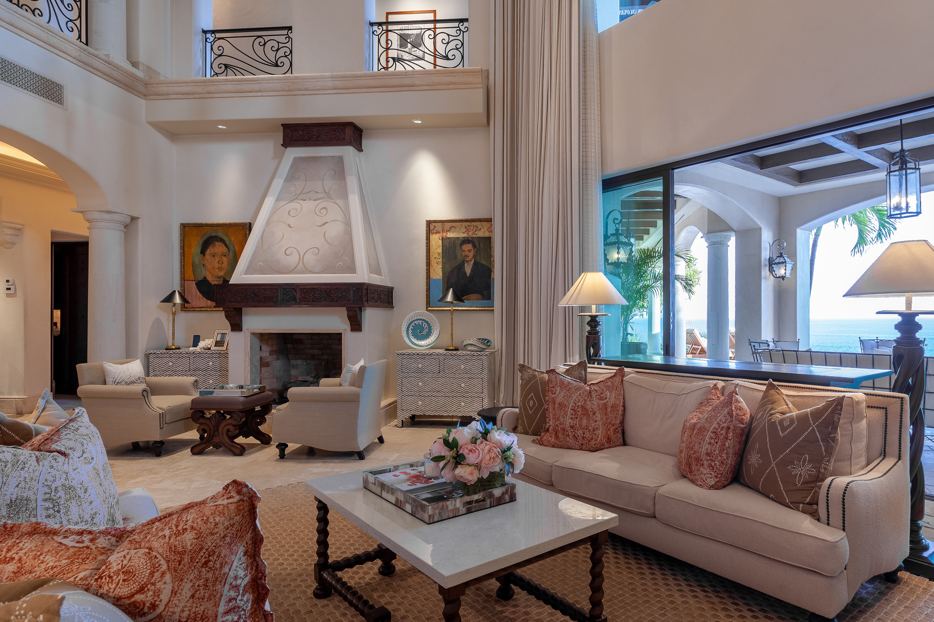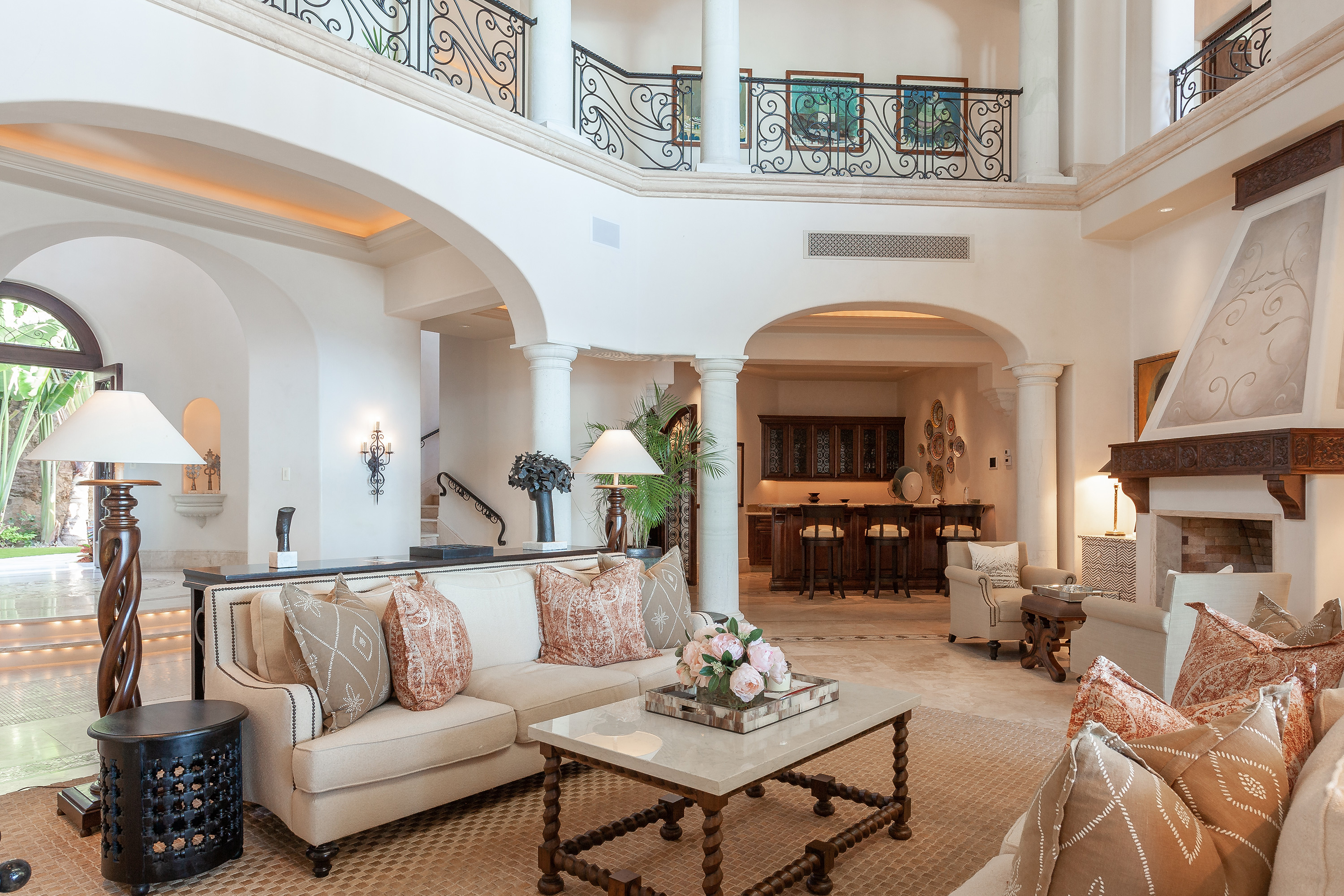 With a variety of excellent amenities, guests will enjoy relaxation and refined style. Sparkling ocean blues will delight you as you step onto the expansive outdoor terrace. Offering an inviting infinity-edge pool and jacuzzi with superb views, the terrace is designed outdoor living and entertaining. Additional outdoor amenities include a barbecue grill, an outdoor dining area, and a fire pit. Inside, you’ll admire the interior design of this thoughtfully curated villa including carved wood furnishings, high ceilings, marble floors, and plush bedrooms. Extra amenities include a gym and two media rooms.