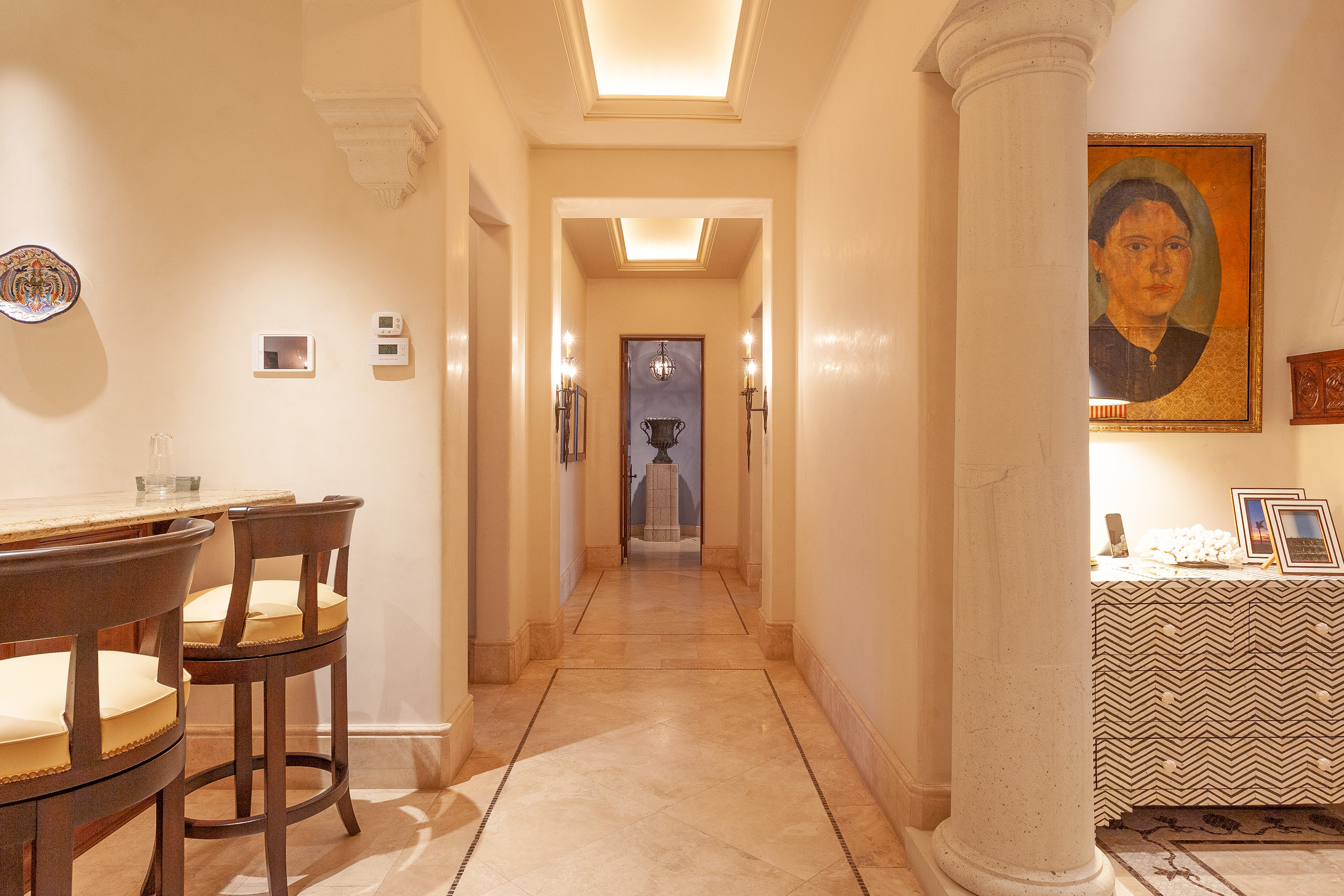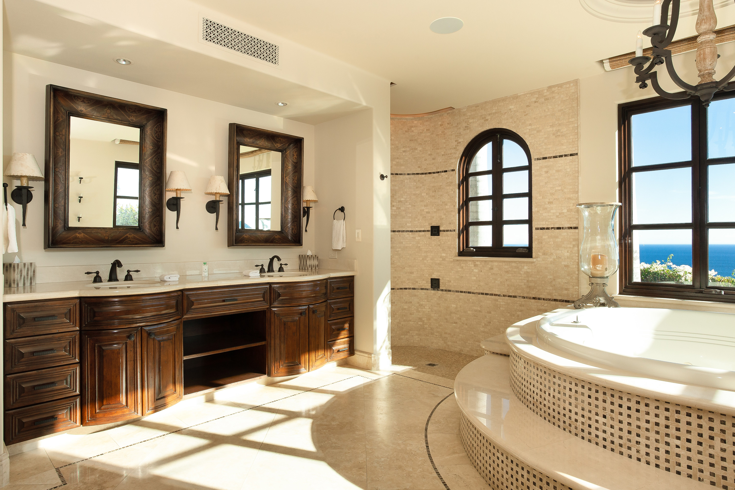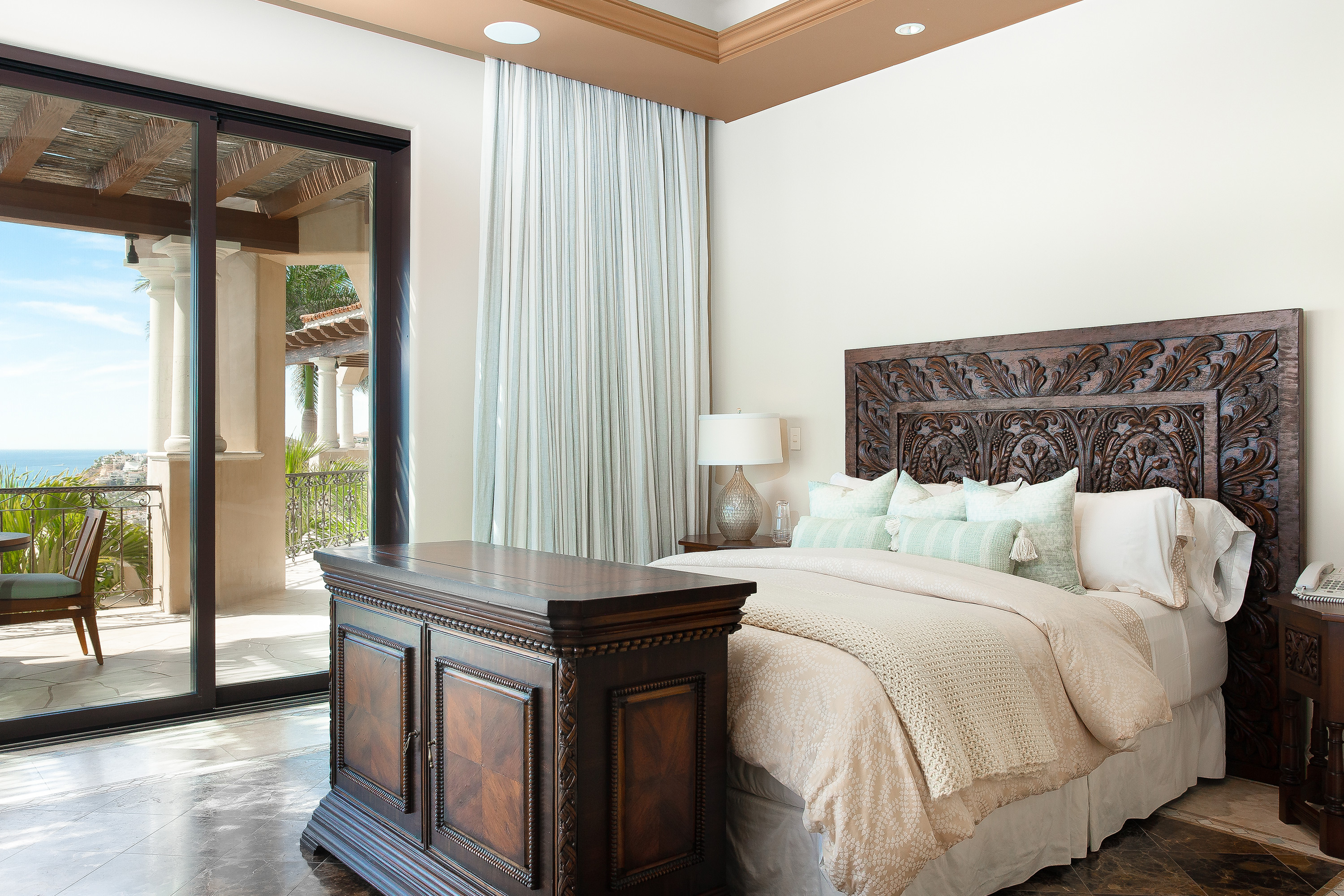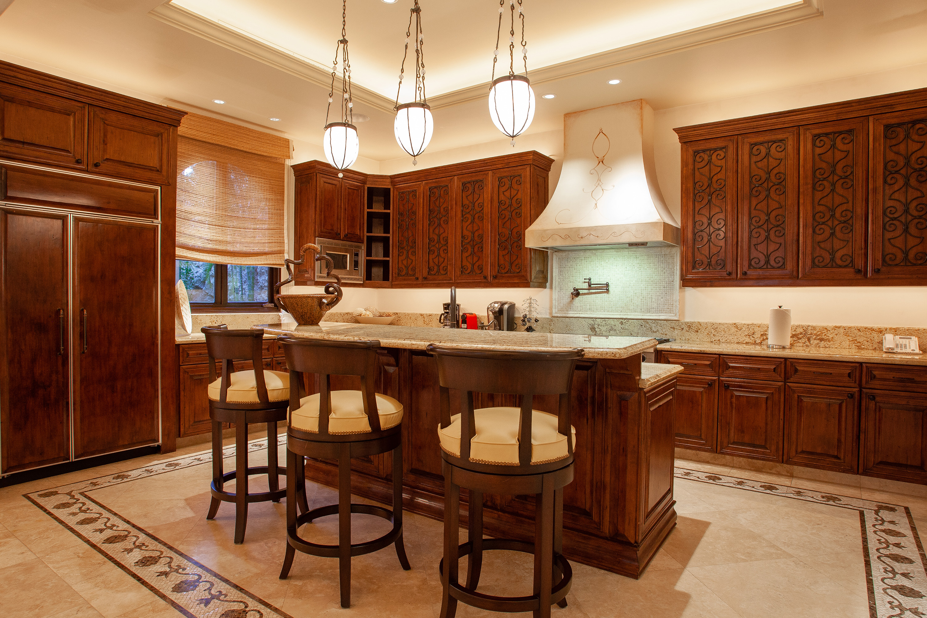 With a variety of excellent amenities, guests will enjoy relaxation and refined style. Sparkling ocean blues will delight you as you step onto the expansive outdoor terrace. Offering an inviting infinity-edge pool and jacuzzi with superb views, the terrace is designed outdoor living and entertaining. Additional outdoor amenities include a barbecue grill, an outdoor dining area, and a fire pit. Inside, you’ll admire the interior design of this thoughtfully curated villa including carved wood furnishings, high ceilings, marble floors, and plush bedrooms. Extra amenities include a gym and two media rooms.