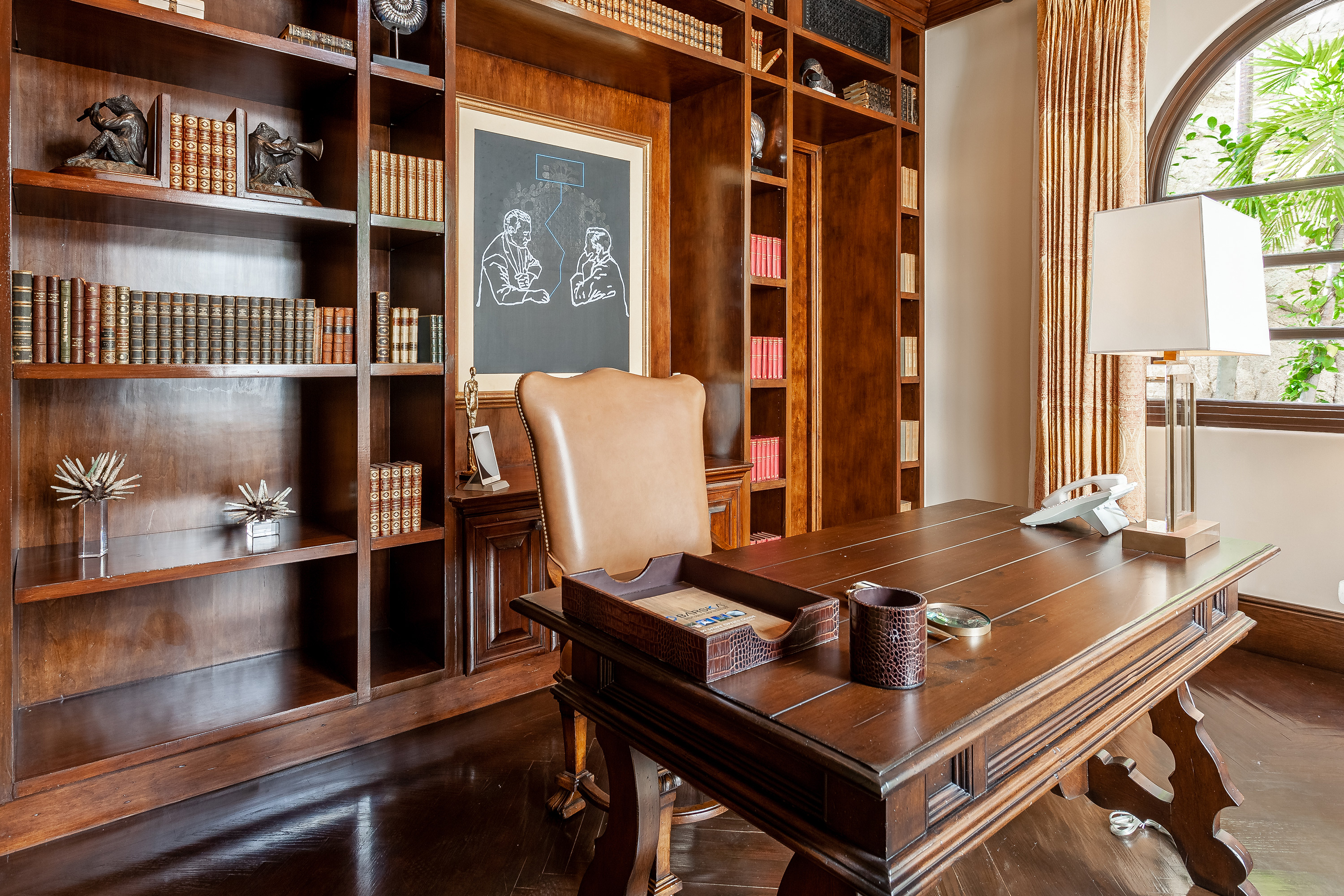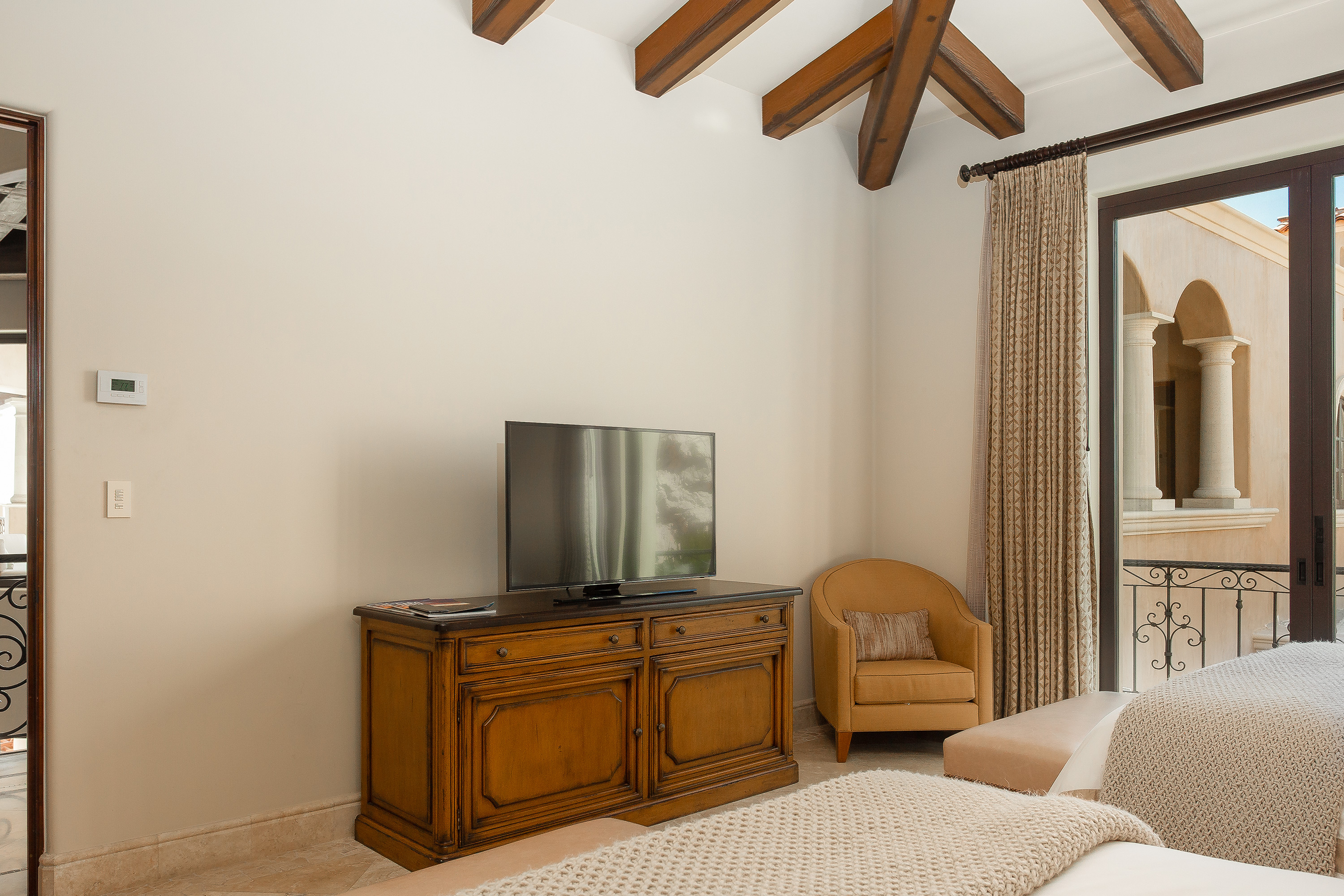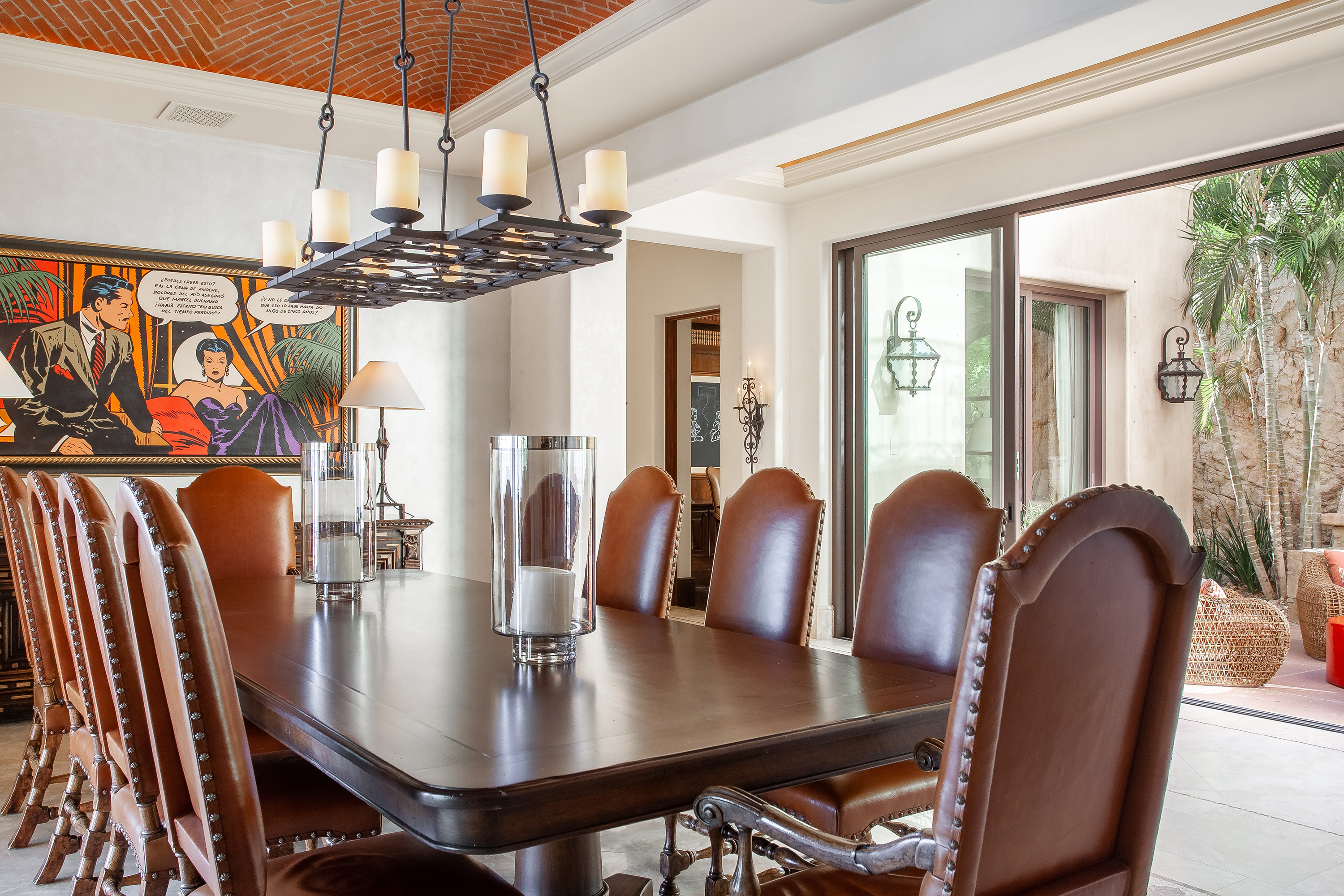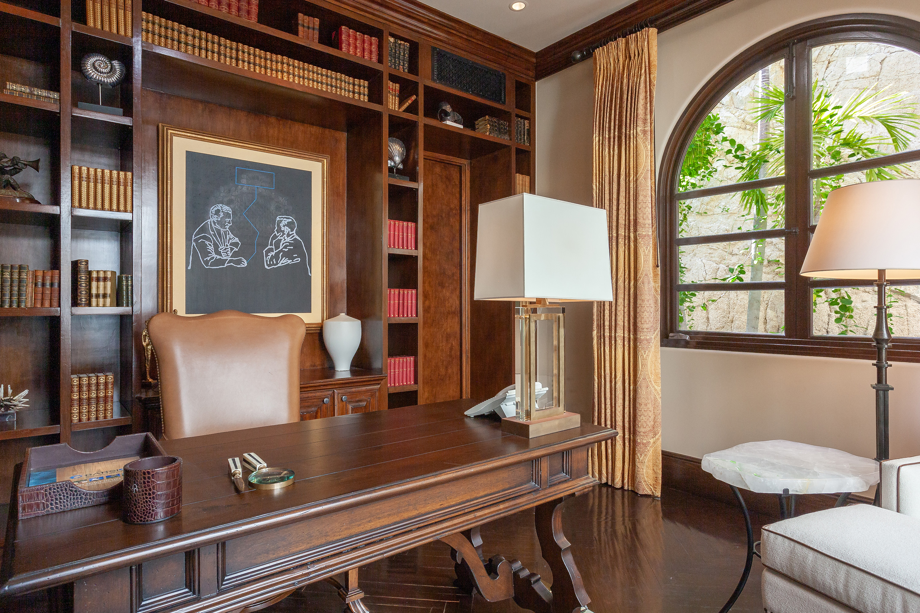 With a variety of excellent amenities, guests will enjoy relaxation and refined style. Sparkling ocean blues will delight you as you step onto the expansive outdoor terrace. Offering an inviting infinity-edge pool and jacuzzi with superb views, the terrace is designed outdoor living and entertaining. Additional outdoor amenities include a barbecue grill, an outdoor dining area, and a fire pit. Inside, you’ll admire the interior design of this thoughtfully curated villa including carved wood furnishings, high ceilings, marble floors, and plush bedrooms. Extra amenities include a gym and two media rooms.