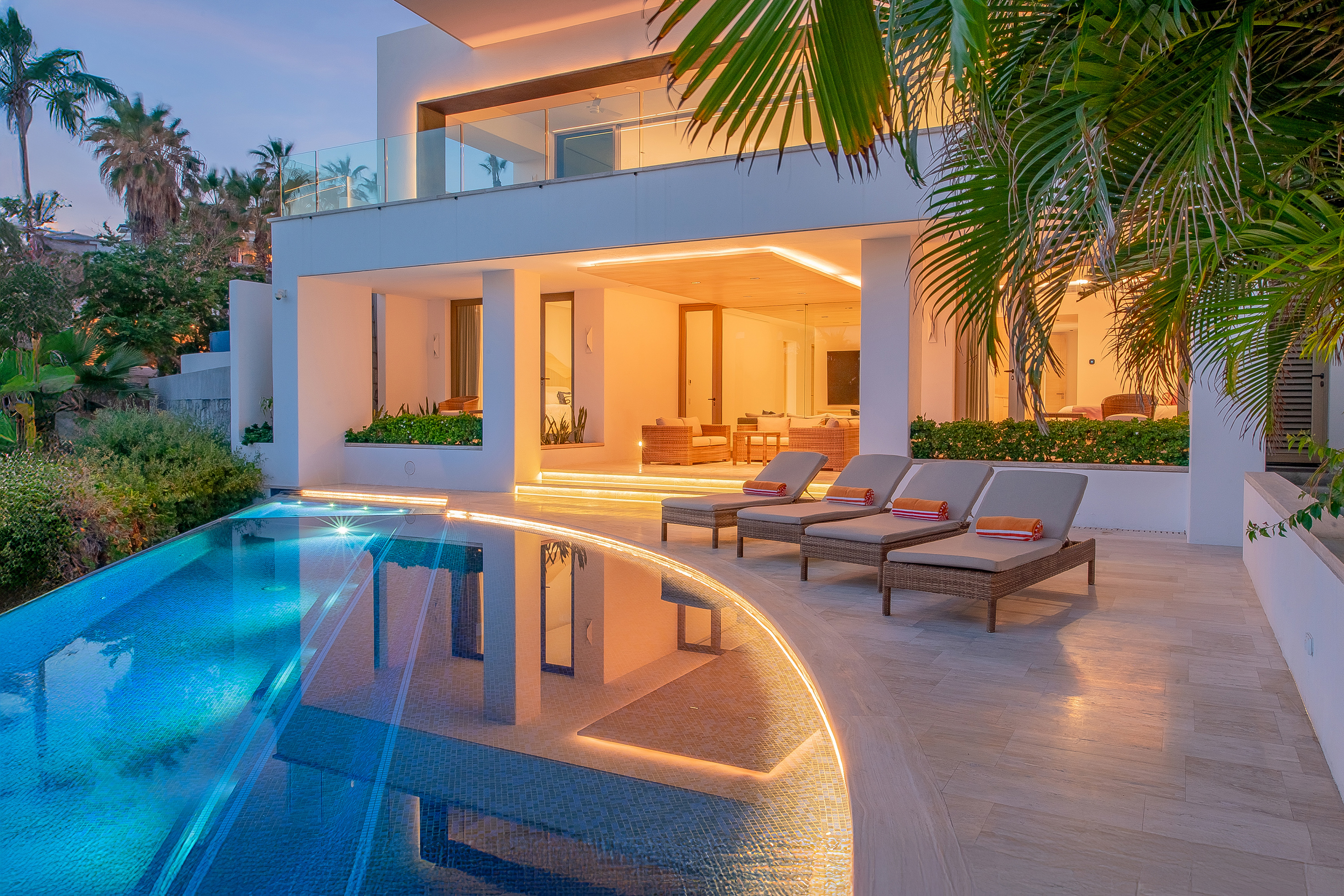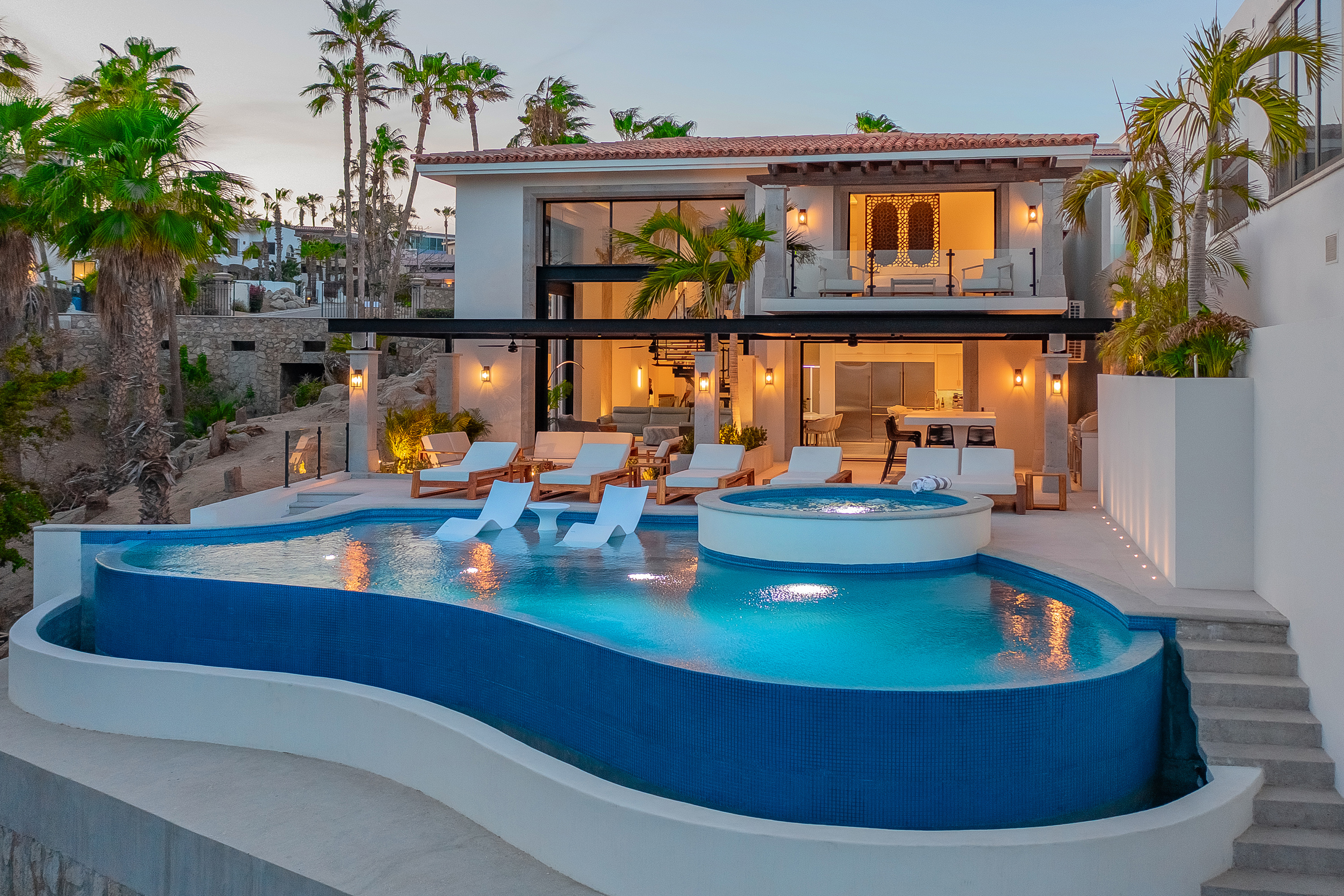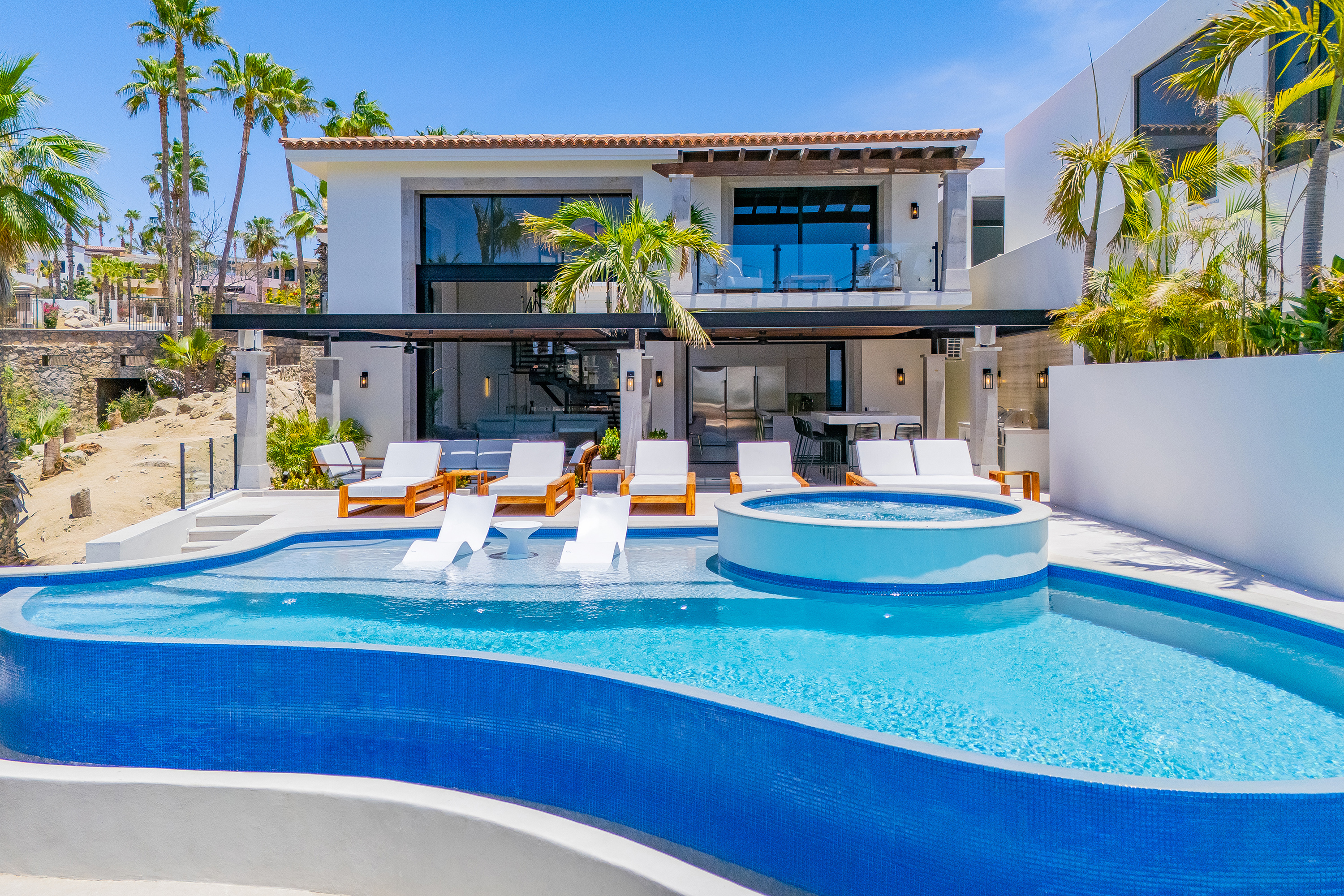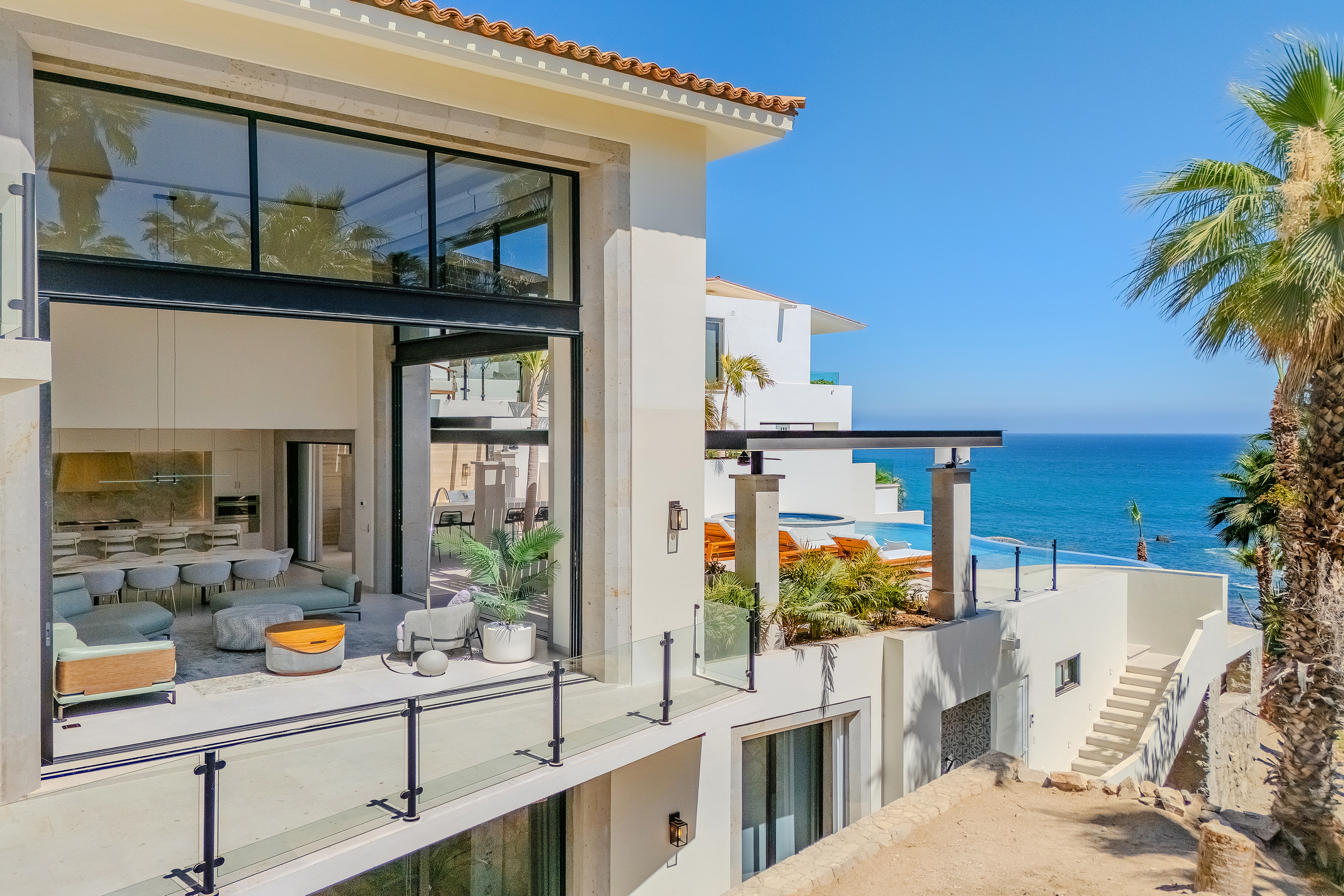 Villa Palma offers a warm, contemporary coastal ambiance with a serene courtyard, inviting living areas, and ocean-view suites designed for relaxation. Complementing it perfectly, Villa Mareas showcases sleek modern design with dramatic architecture, an infinity-edge pool, private spa with steam room, cold plunge, and Jacuzzi, along with premium fitness and entertainment spaces. Together, the villas provide luxurious ensuite bedrooms, generous gathering areas, gourmet kitchens, and beautiful outdoor terraces for dining, entertaining, and sunset moments. With direct beach access, concierge service, and daily housekeeping, Villa Palma and Villa Mareas offer an unmatched blend of privacy, comfort, and elevated coastal living in Los Cabos.