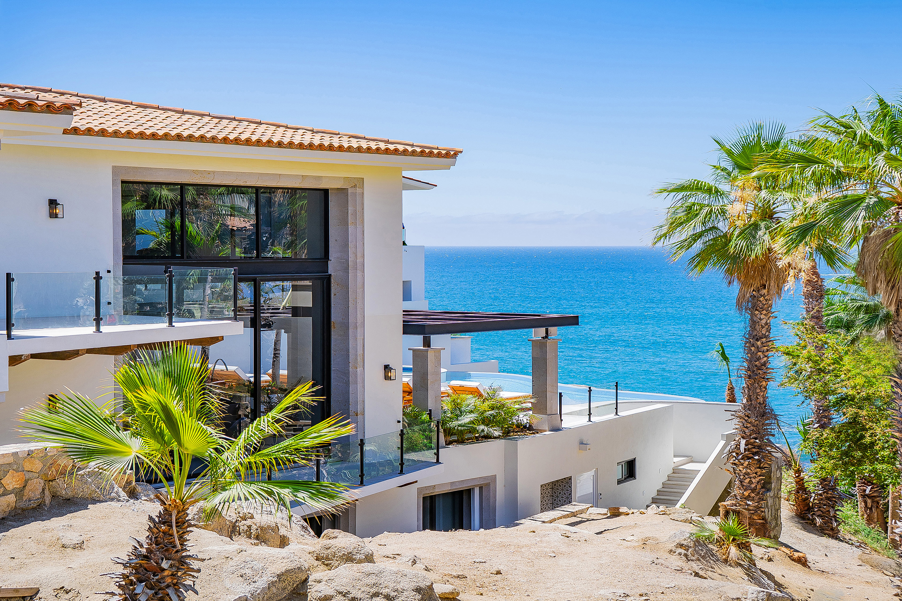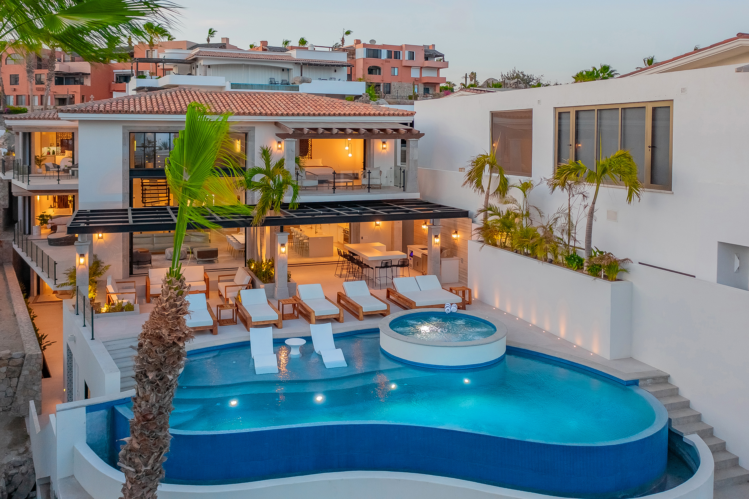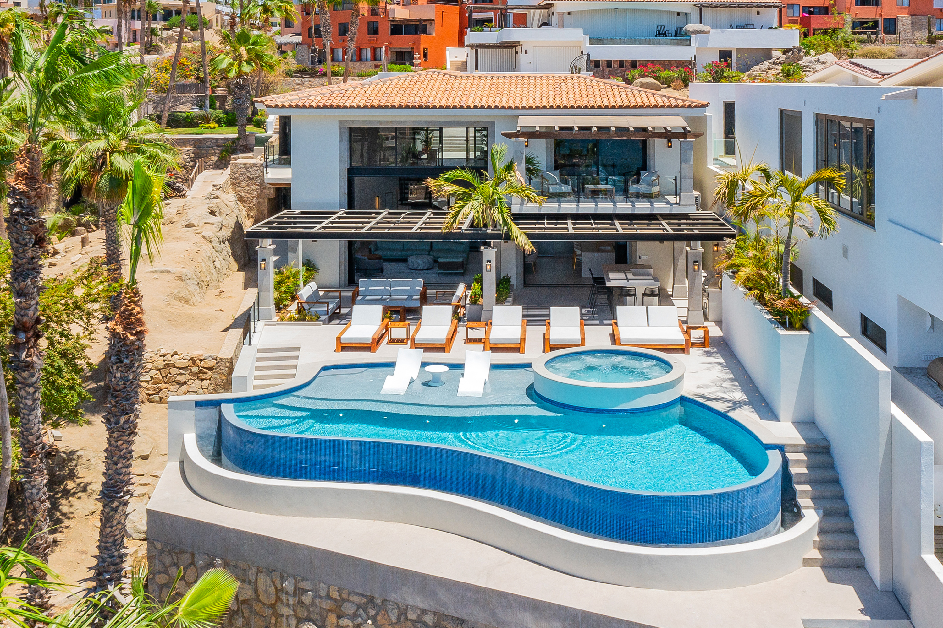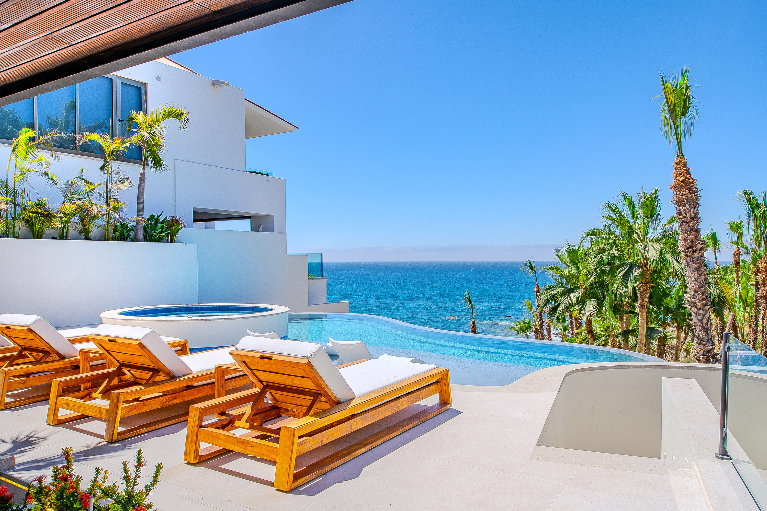 Villa Palma offers a warm, contemporary coastal ambiance with a serene courtyard, inviting living areas, and ocean-view suites designed for relaxation. Complementing it perfectly, Villa Mareas showcases sleek modern design with dramatic architecture, an infinity-edge pool, private spa with steam room, cold plunge, and Jacuzzi, along with premium fitness and entertainment spaces. Together, the villas provide luxurious ensuite bedrooms, generous gathering areas, gourmet kitchens, and beautiful outdoor terraces for dining, entertaining, and sunset moments. With direct beach access, concierge service, and daily housekeeping, Villa Palma and Villa Mareas offer an unmatched blend of privacy, comfort, and elevated coastal living in Los Cabos.