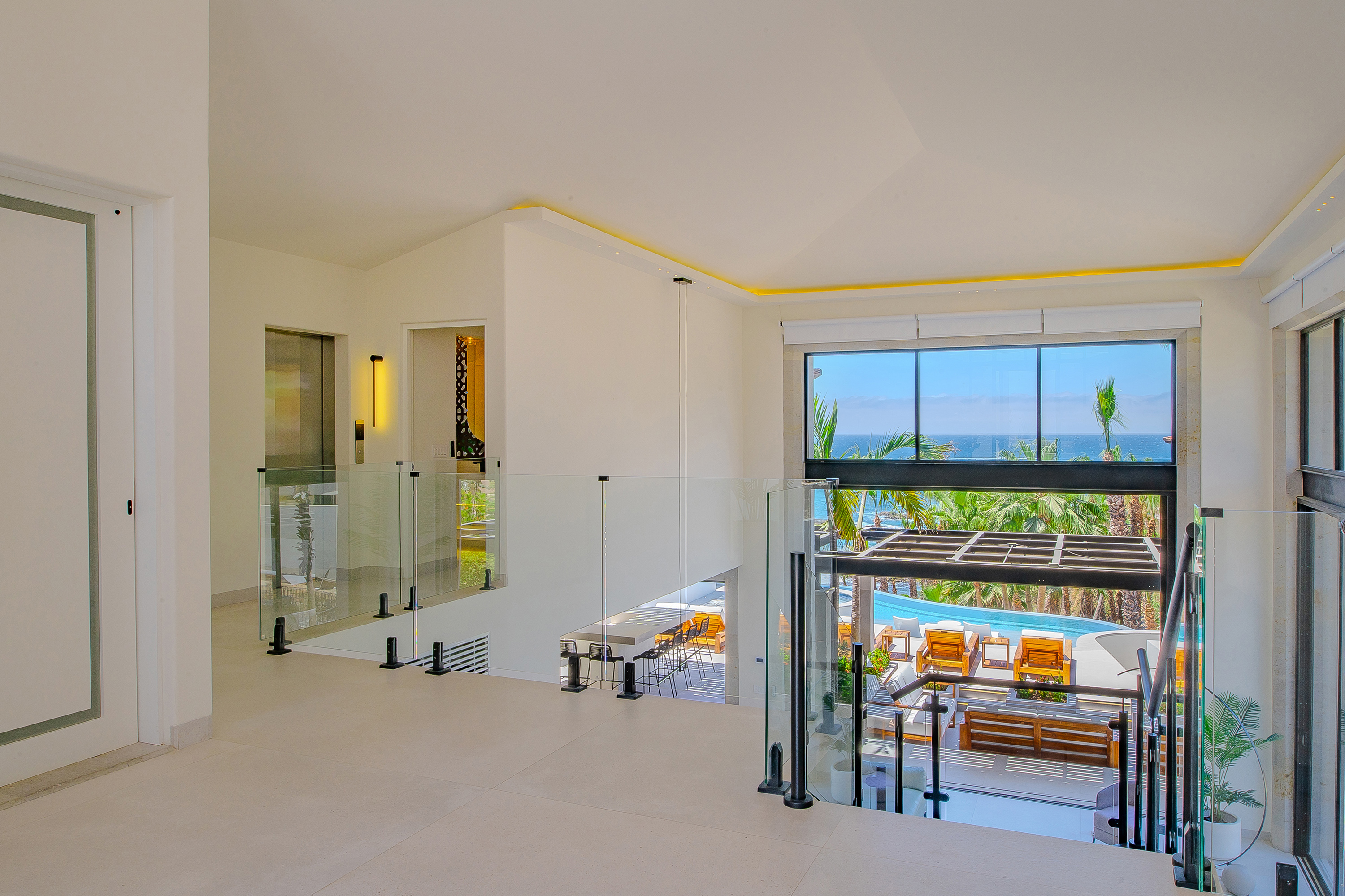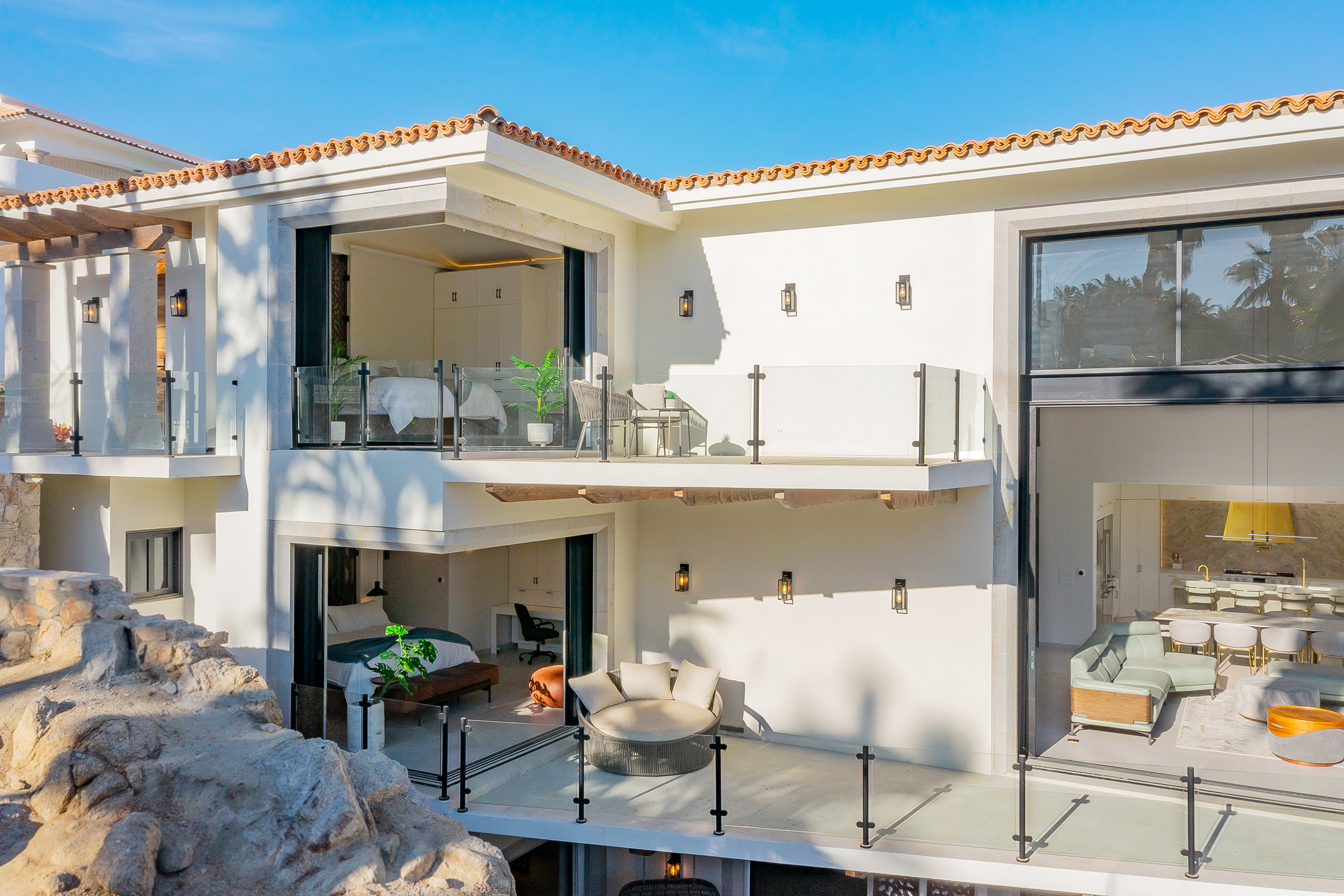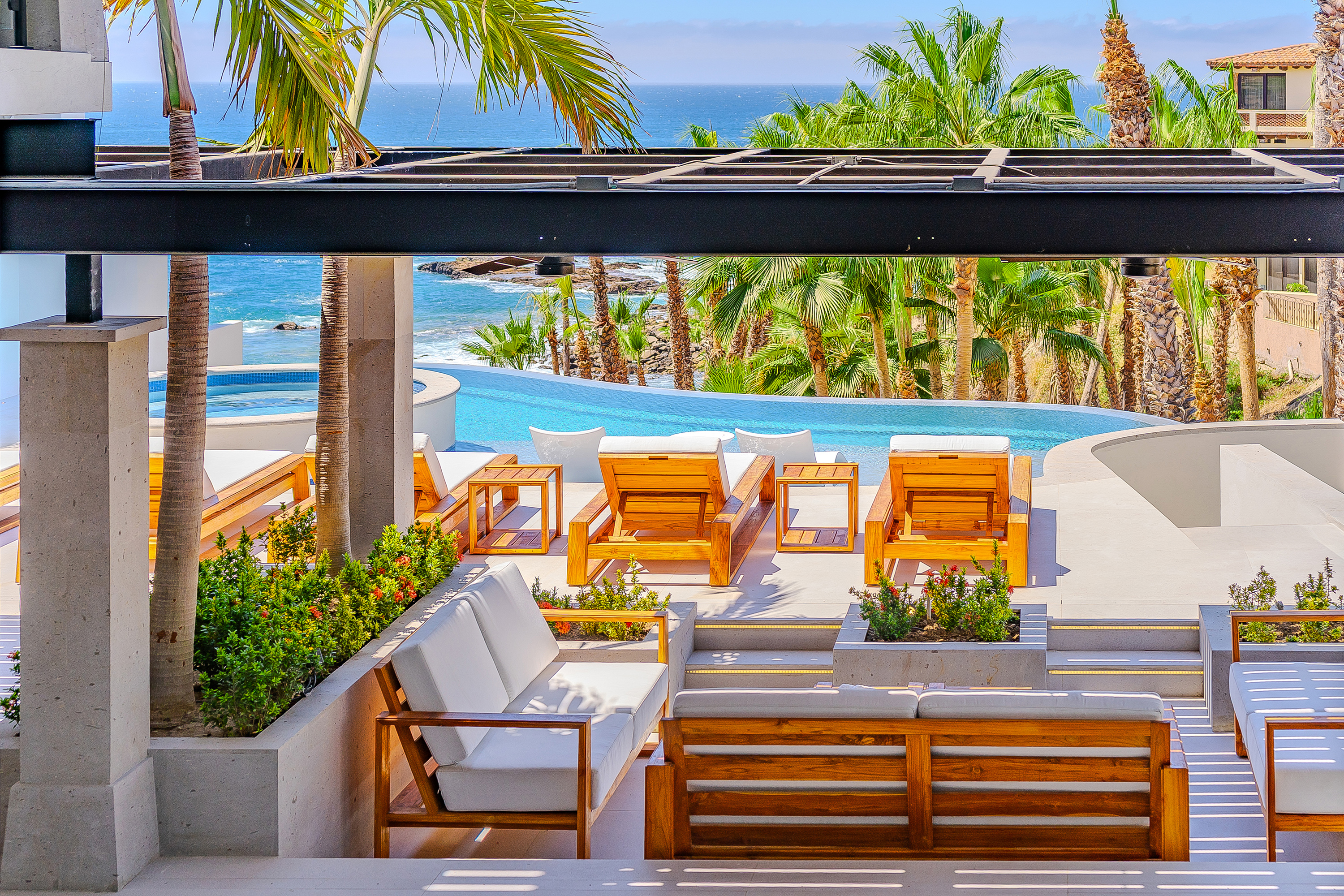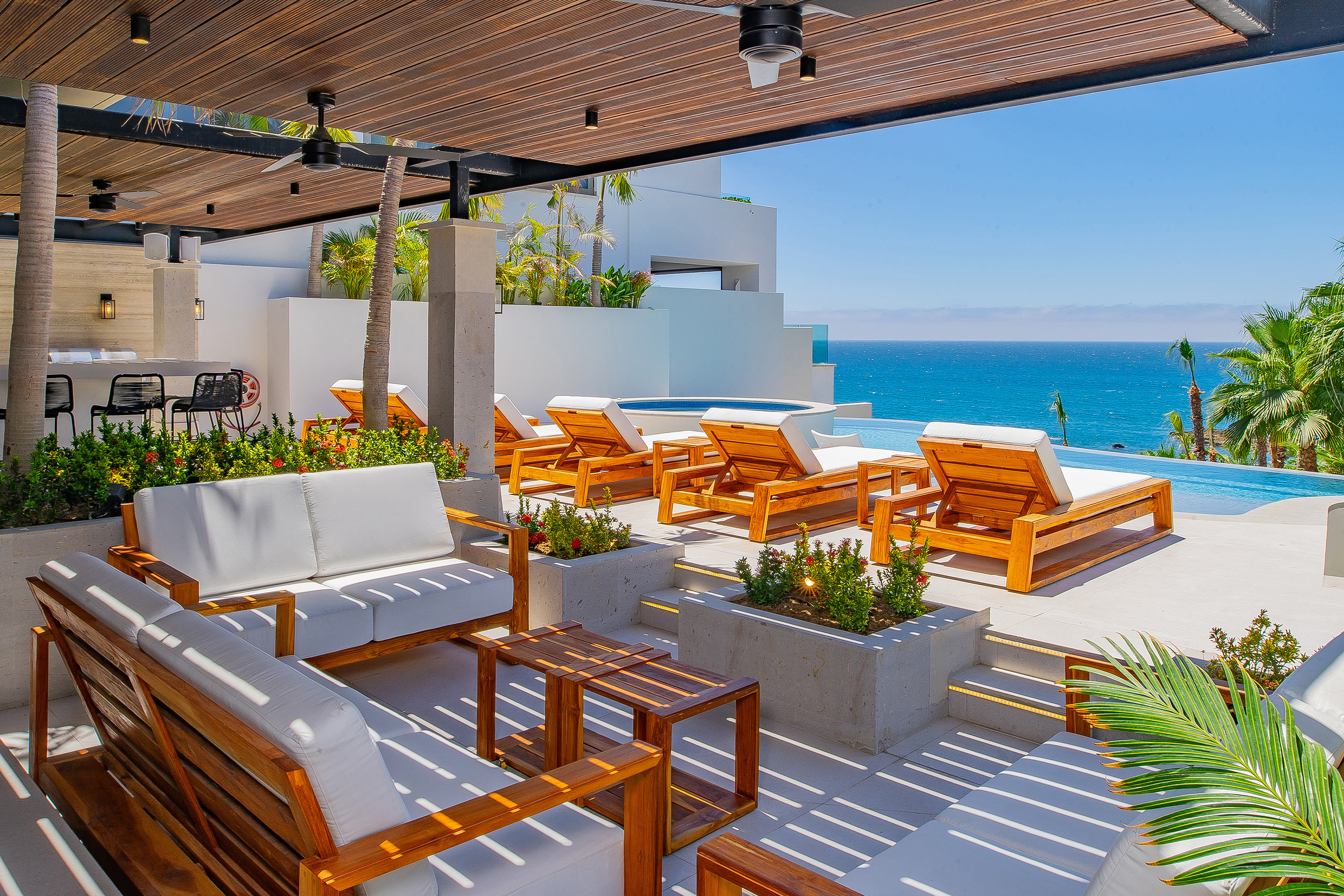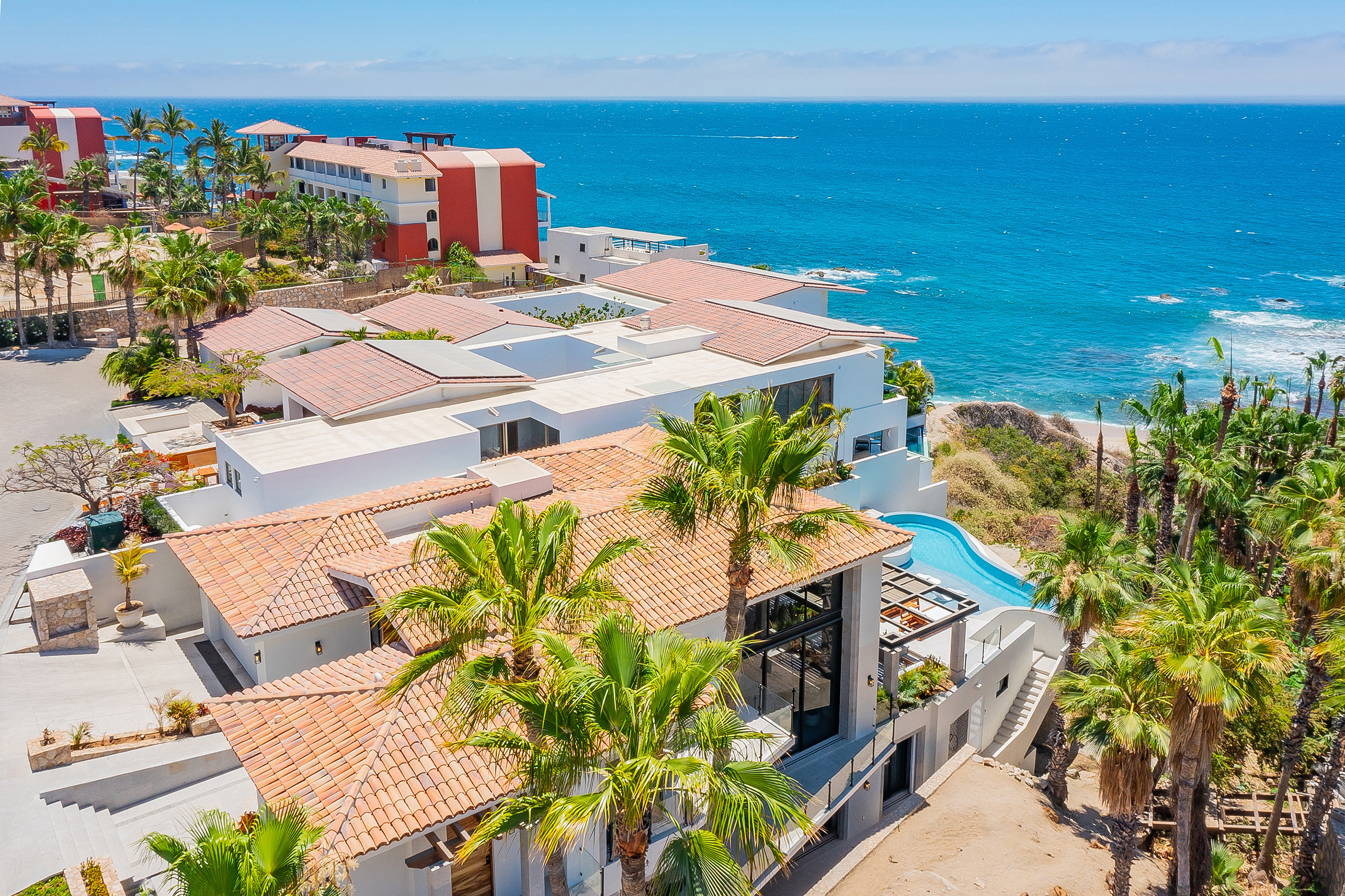 Villa Palma offers a warm, contemporary coastal ambiance with a serene courtyard, inviting living areas, and ocean-view suites designed for relaxation. Complementing it perfectly, Villa Mareas showcases sleek modern design with dramatic architecture, an infinity-edge pool, private spa with steam room, cold plunge, and Jacuzzi, along with premium fitness and entertainment spaces. Together, the villas provide luxurious ensuite bedrooms, generous gathering areas, gourmet kitchens, and beautiful outdoor terraces for dining, entertaining, and sunset moments. With direct beach access, concierge service, and daily housekeeping, Villa Palma and Villa Mareas offer an unmatched blend of privacy, comfort, and elevated coastal living in Los Cabos.