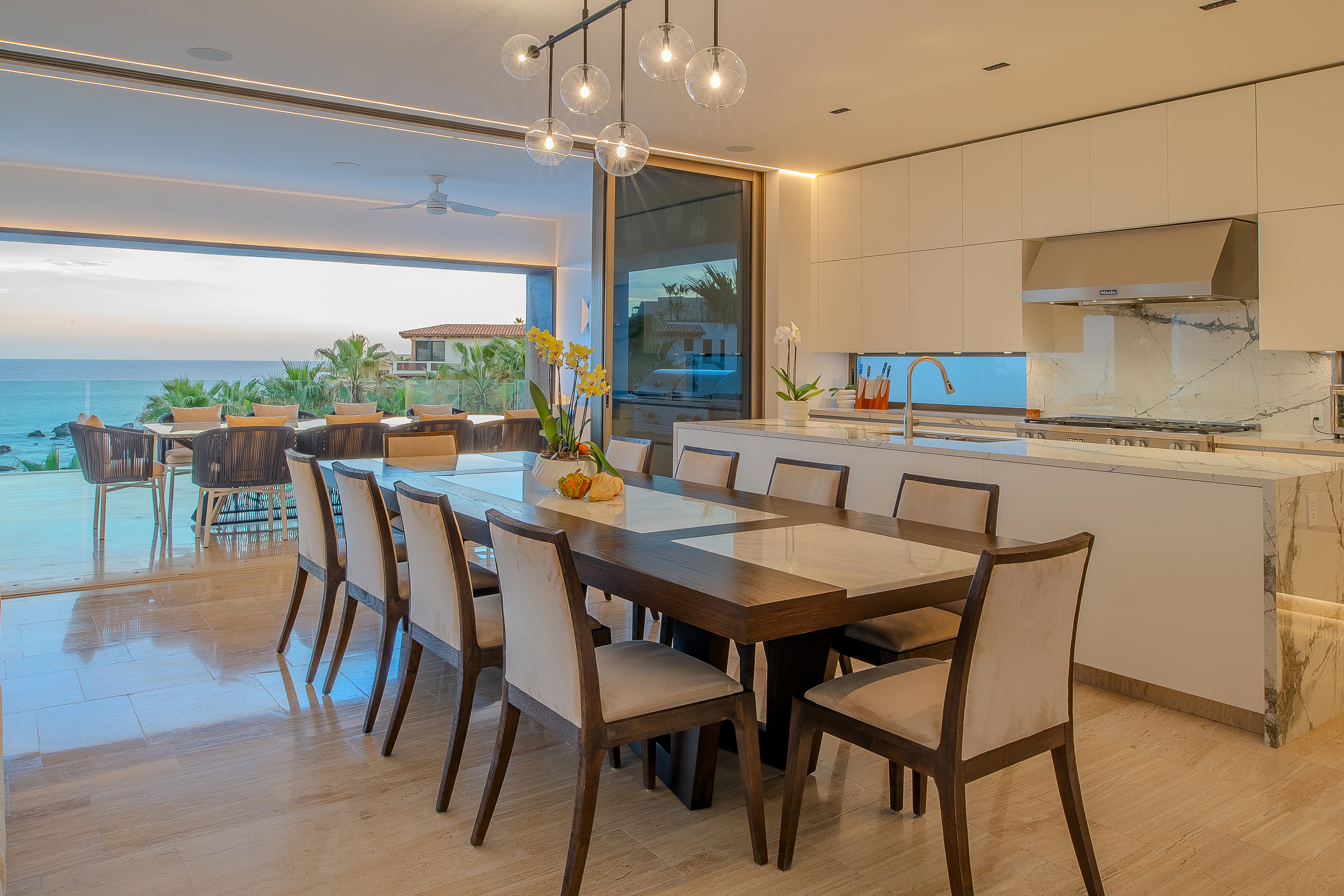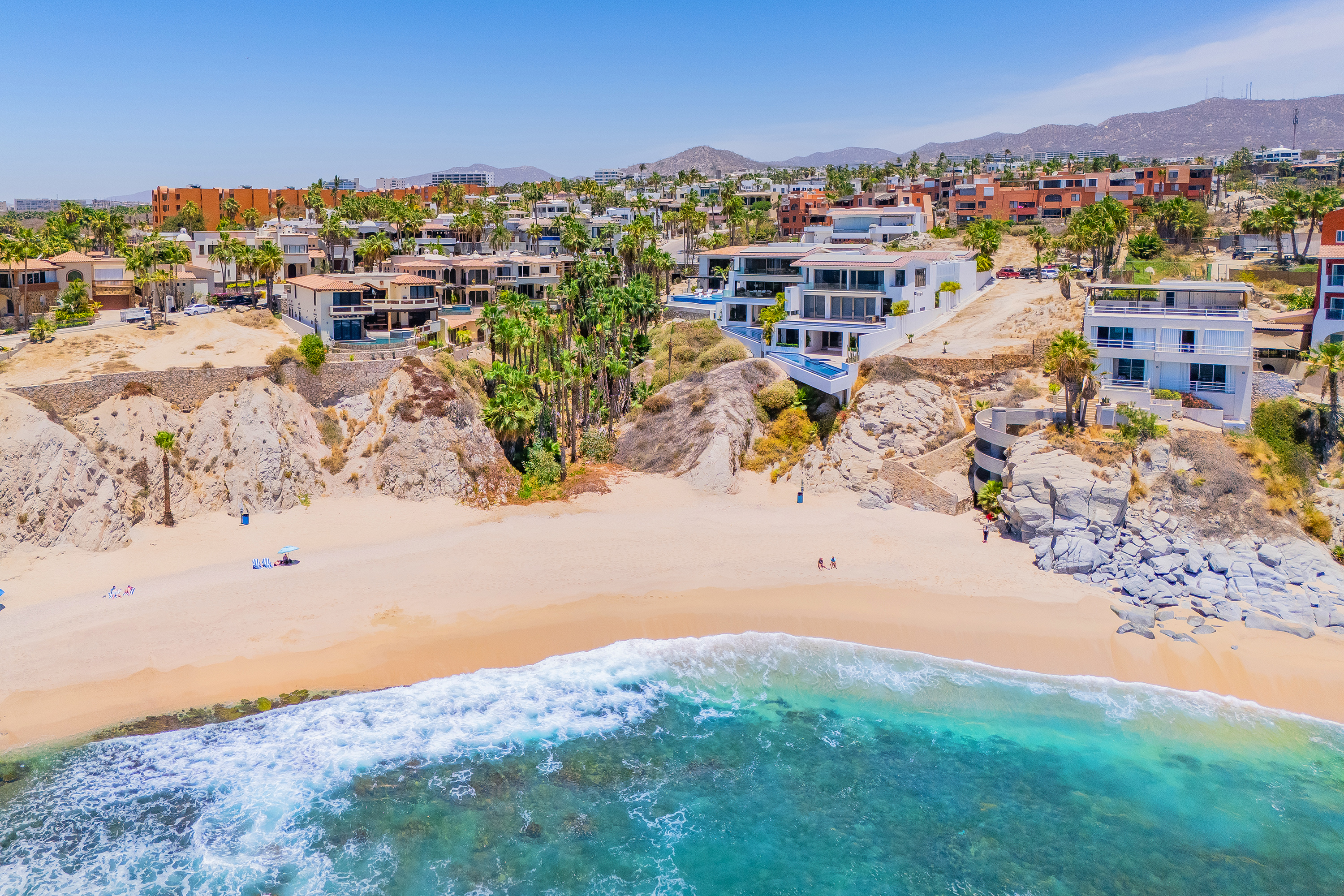 Villa Palma and Villa Mareas together form an exceptional beachfront retreat in Los Cabos, set side by side along a rare swimmable beach in the exclusive Cabo Bello corridor. Ideal for large groups, multi-generational families, retreats, or special celebrations, this combined offering delivers expansive indoor-outdoor living, seamless group flow, and sweeping Sea of Cortez views from nearly every space.